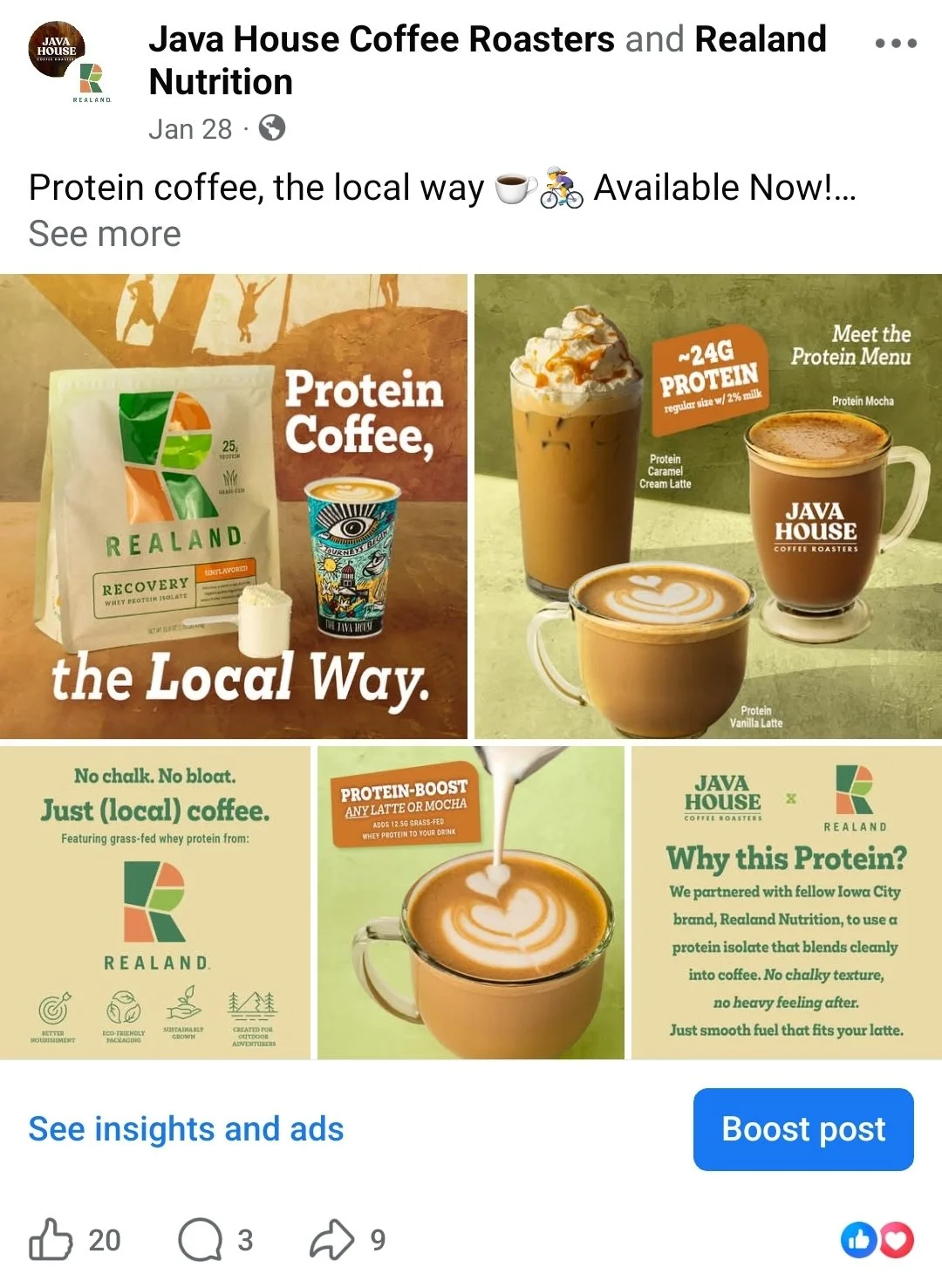 This collection showcases digital and print assets designed for the launch of Java House’s protein beverages, made with protein sourced from another local Iowa City brand. Community and collaboration were central to the creative approach, with visuals that celebrate both brands and emphasize locally sourced ingredients.