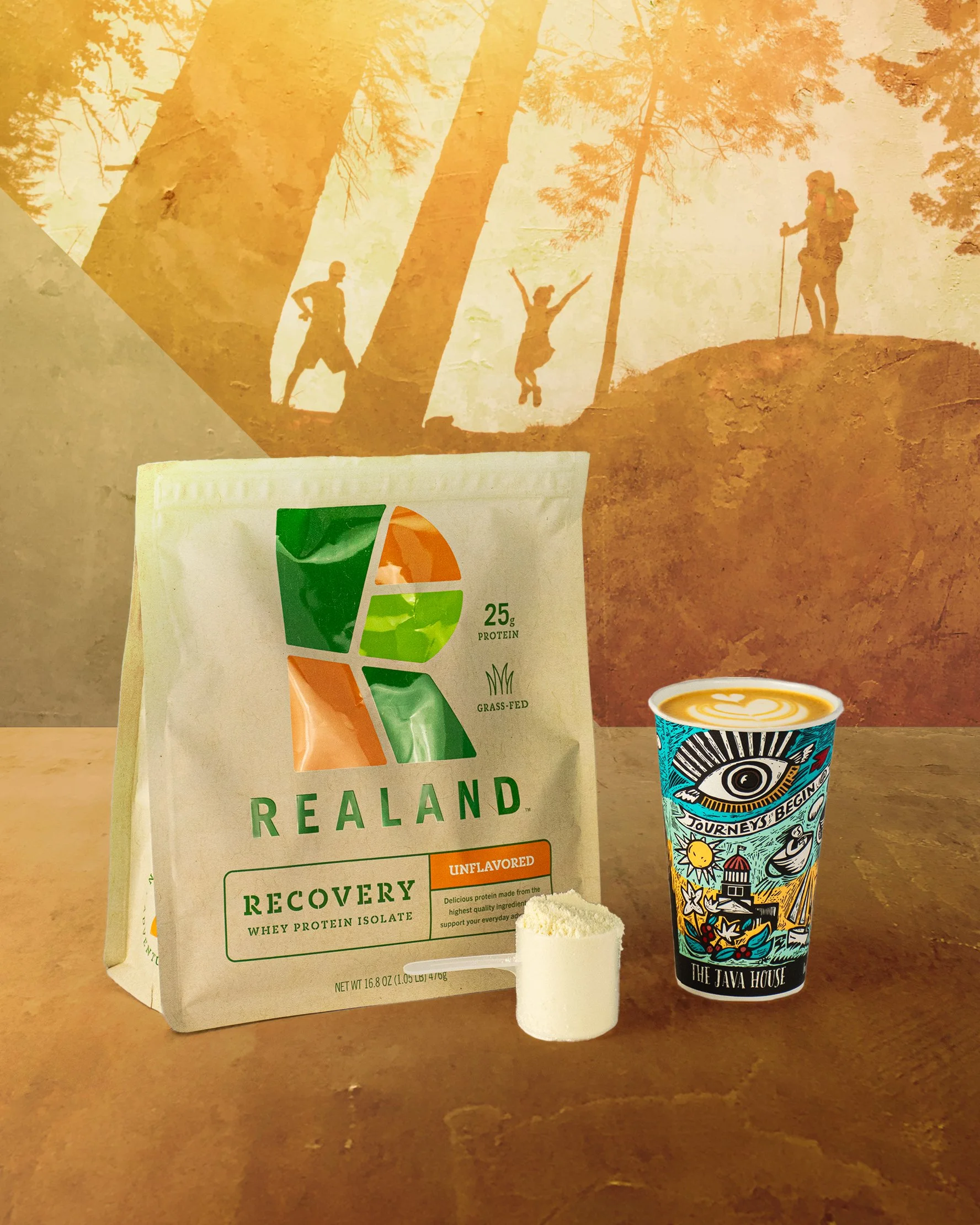 Visual: Coffee cup + outdoor backdrop (trail, gravel, trees).Why Realand: